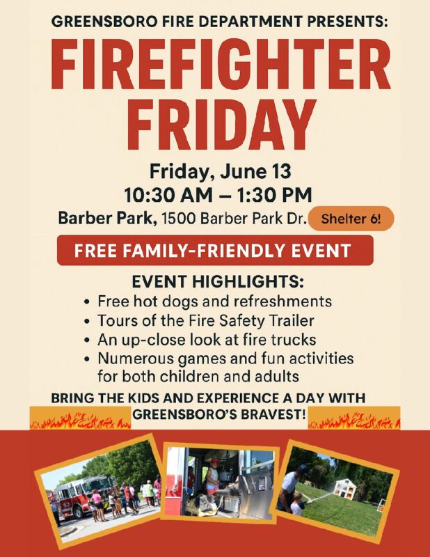The Greensboro Fire Department will host its annual Firefighter Friday event on Friday, June 14, from 10:30 a.m. to 1:30 p.m. at Barber Park (shelters 4, 5, and 6). This free, family-friendly event offers a unique opportunity for the community to connect with local firefighters while learning about fire safety. Attendees can enjoy free hot dogs and refreshments, explore the Fire Safety Trailer, get an up-close look at fire trucks, and participate in games and activities for all ages. Fire Chief Jim Robinson highlights the event as an important part of community engagement and education, offering residents a fun and informative glimpse into the world of firefighting.