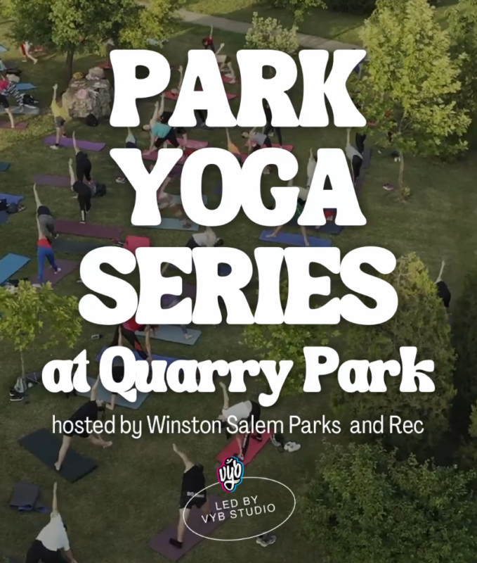 Quarry Park Yoga Series is hosted by vyb studio and Winston Salem Parks & Rec. These classes are free to attend, but registration is required through Winston-Salem Parks and Recreation.